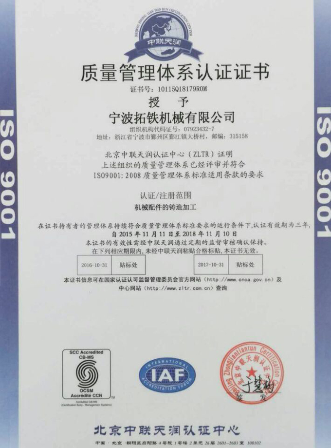 2015年11月,拓鐵機(jī)械獲得國(guó)家ISO9001質(zhì)量管理體系認(rèn)證,ISO14001環(huán)境管理體系認(rèn)證和OHSAS18001職業(yè)健康安全管理體系認(rèn)證。