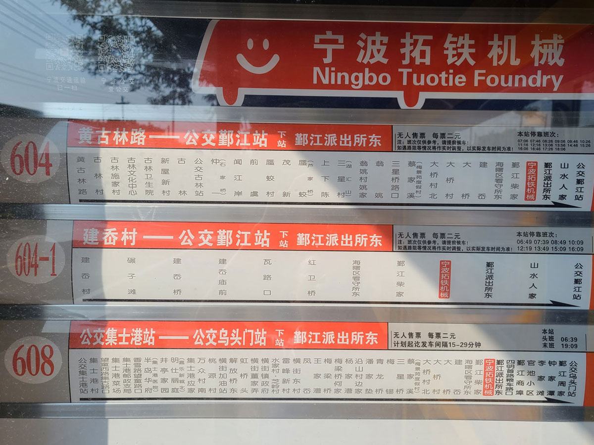近期,位于寧波市海曙區(qū)鄞江鎮(zhèn)大橋村的“拓鐵機(jī)械”公交車(chē)站投入運(yùn)營(yíng),正式并入3條公交線路:604路、604-1路、608路。這將進(jìn)一步為寧波拓鐵機(jī)械有限公司廣大員工及家屬們的日常出行提供便利。